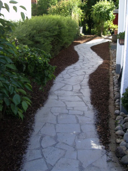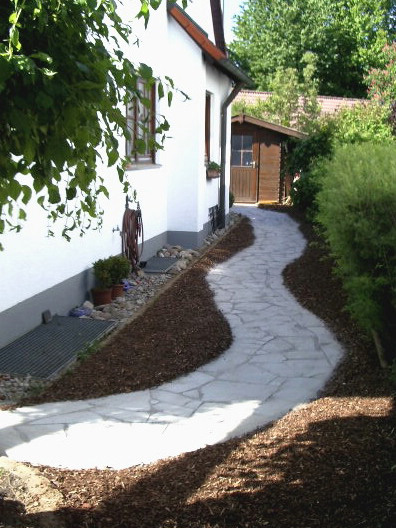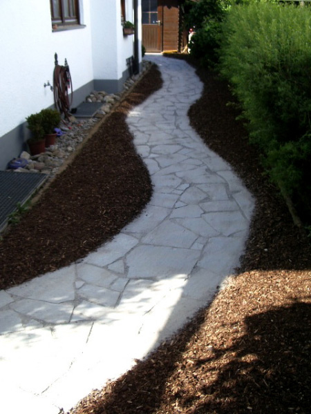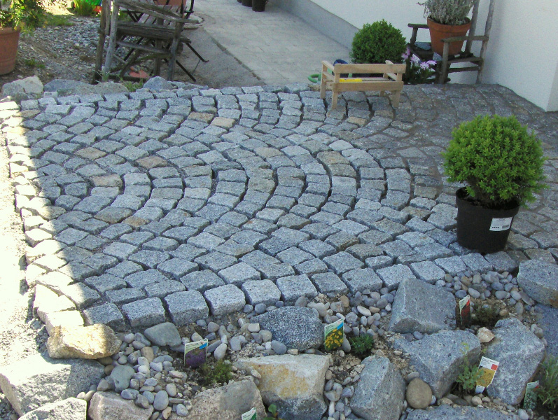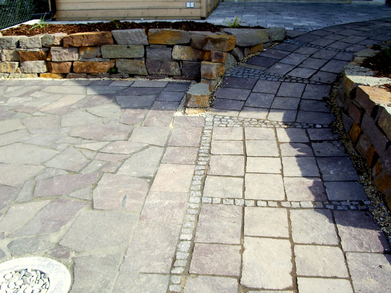 Die verschiedensten Eindrücke kann man im Wegebau, aber auch bei Sitzplätzen durch die schier unbegrenzte Auswahl der Materialien Naturstein, Betonstein und Zierkies bzw. durch eine Kombination derselben entstehen lassen.